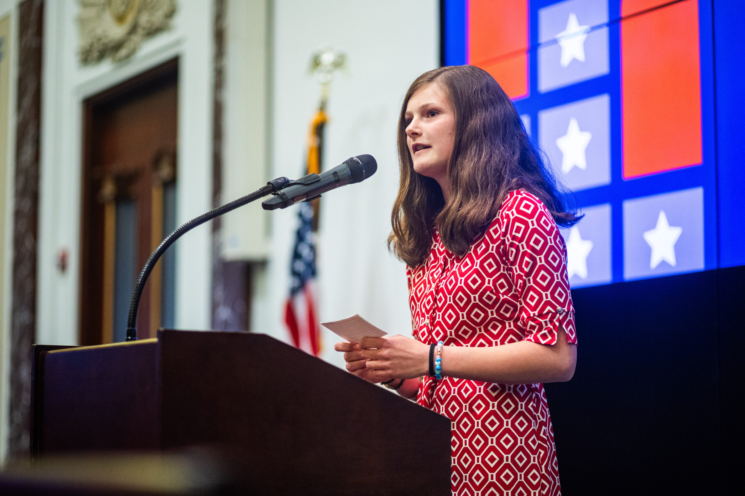 To enter the 2025 National Civics Bee, students in sixth, seventh, and eighth grades submitted essays describing how they would improve their communities through civics. The top-scoring entrants advanced to a local bee designed to test their civics knowledge during two rounds of civics quiz questions and a Q&A with a distinguished panel of judges. Local winners advanced to their state’s finals, taking place through August. The first-place winner from each state final received a trip to Washington to compete in the National Championship.